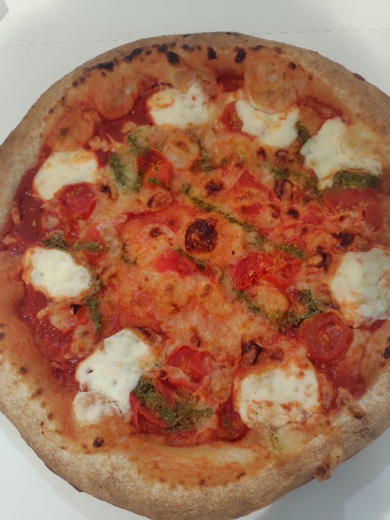 一口食べるとモチモチの生地、トマトソースの酸味、バジルソースとチーズの調和・・・。